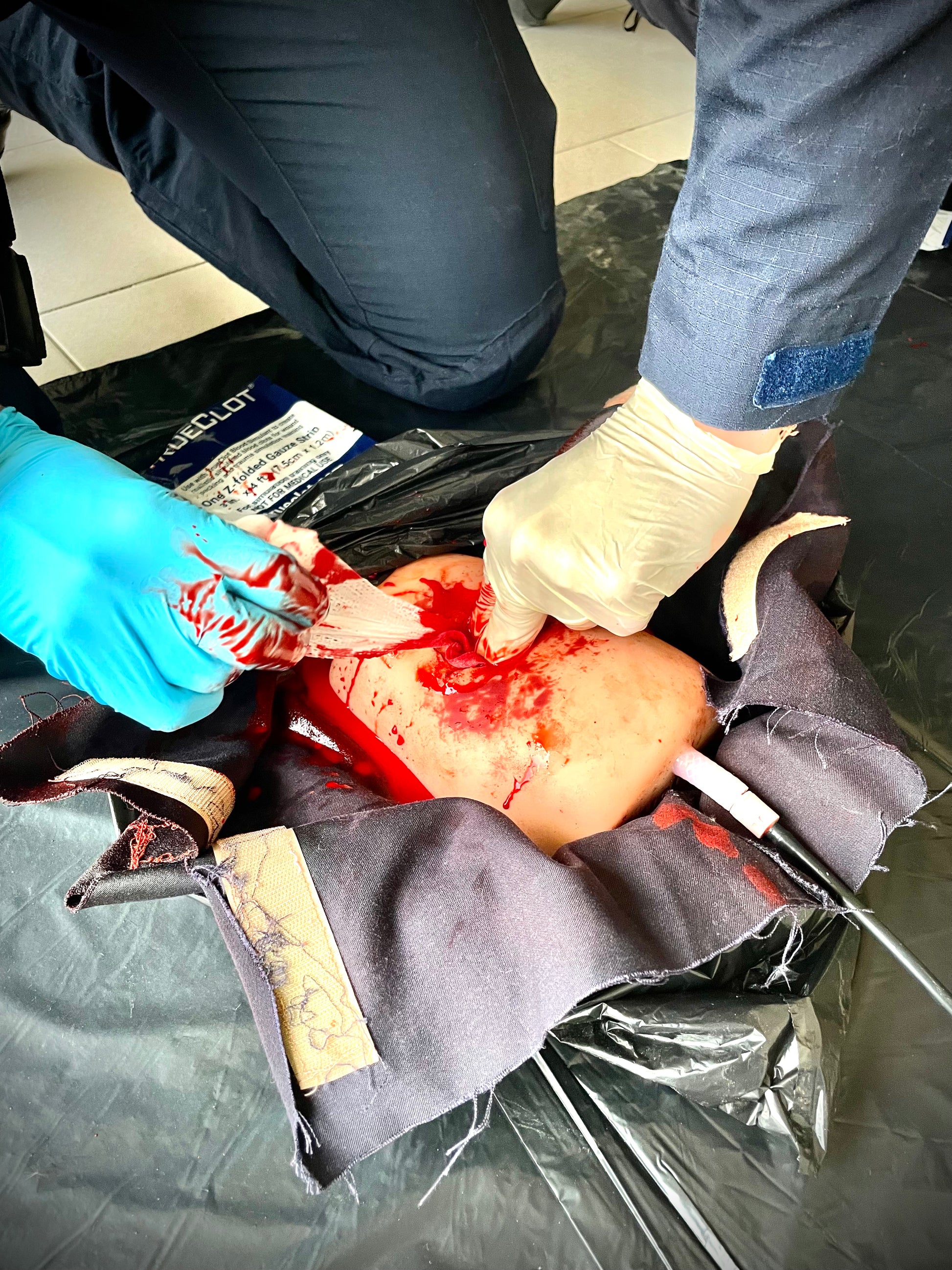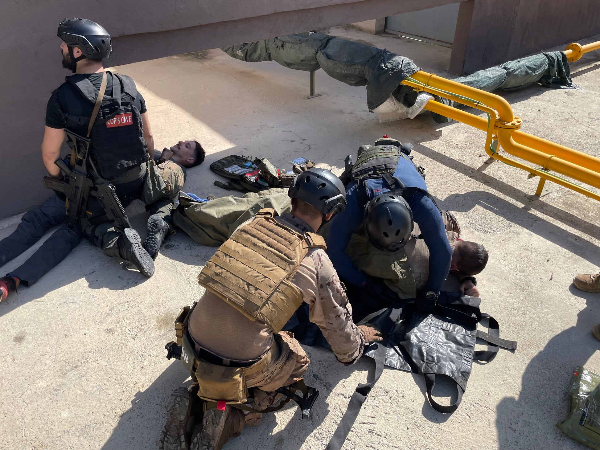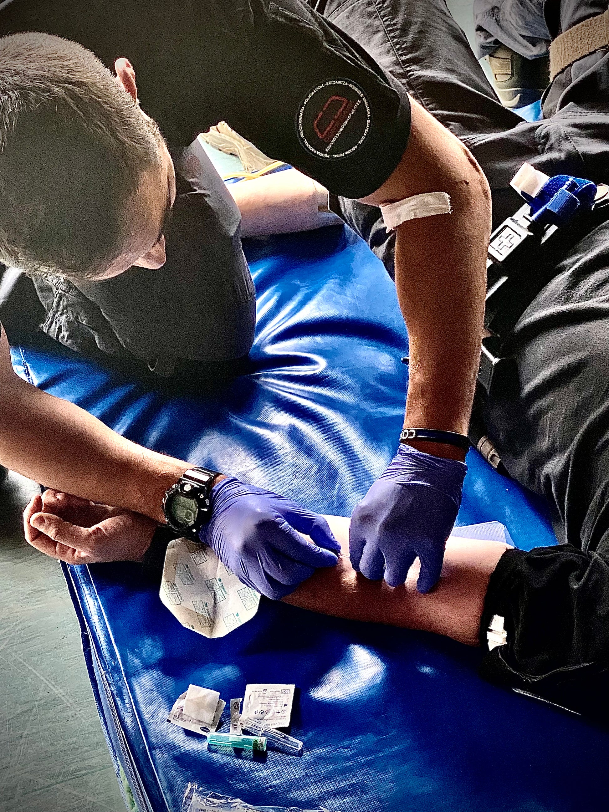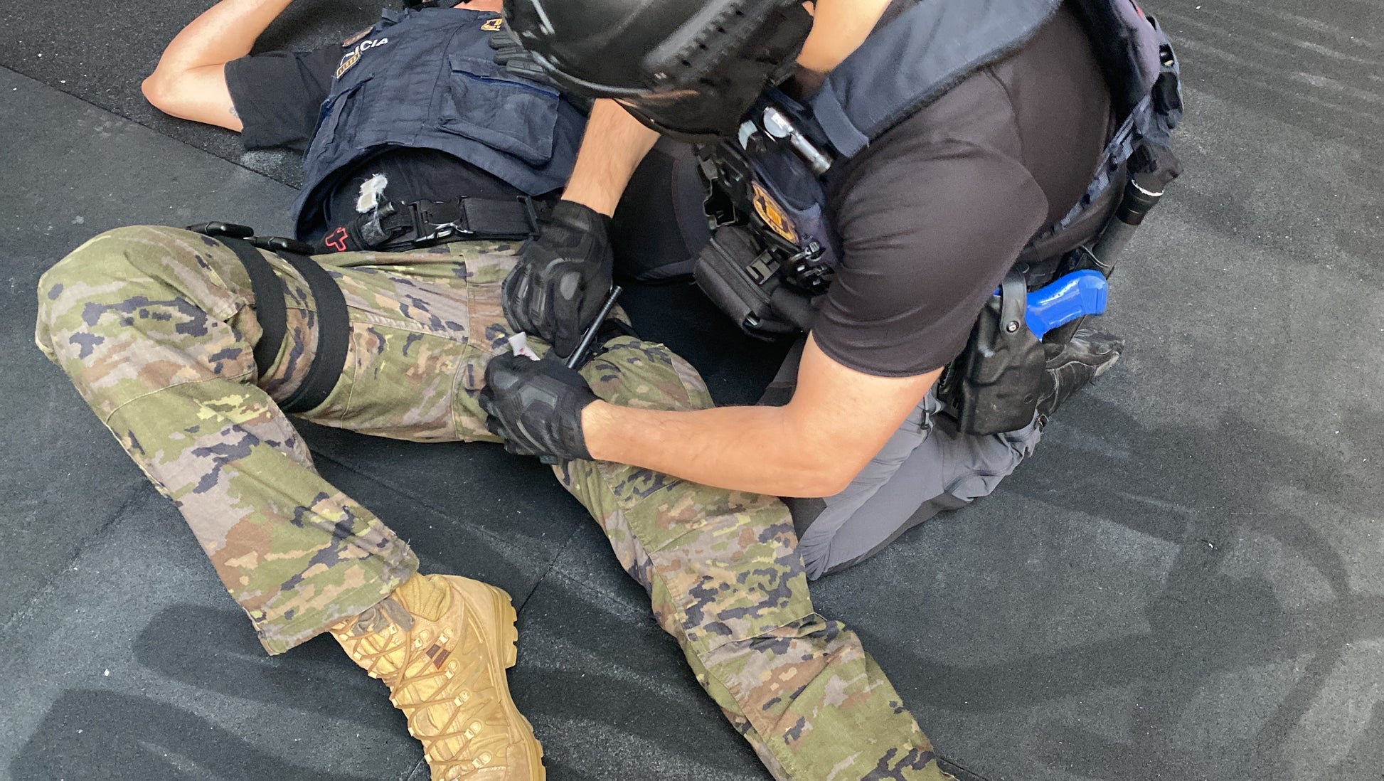 - Simuladores de heridas, camillas y materiales tácticos durante el curso